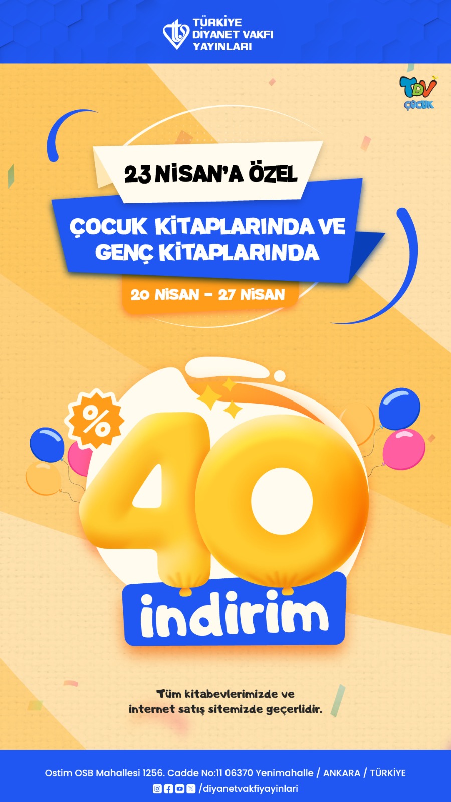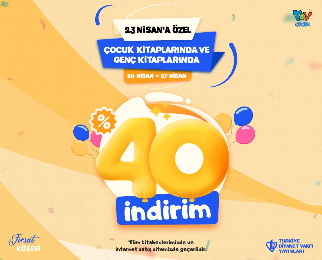 23 Nisan Ulusal Egemenlik ve Çocuk Bayramı, Türkiye Diyanet Vakfı Yayınları’nda çocukları sevindirecek bir kampanya ile kutlanıyor. 20-27 Nisan tarihleri arasında bir hafta boyunca geçerli olan kampanya, tüm çocuk kitaplarında %40 indirim imkânı sağlıyor. Genç kitaplarını da kapsayan kampanya büyük indirim oranı ile dikkat çekiyor.